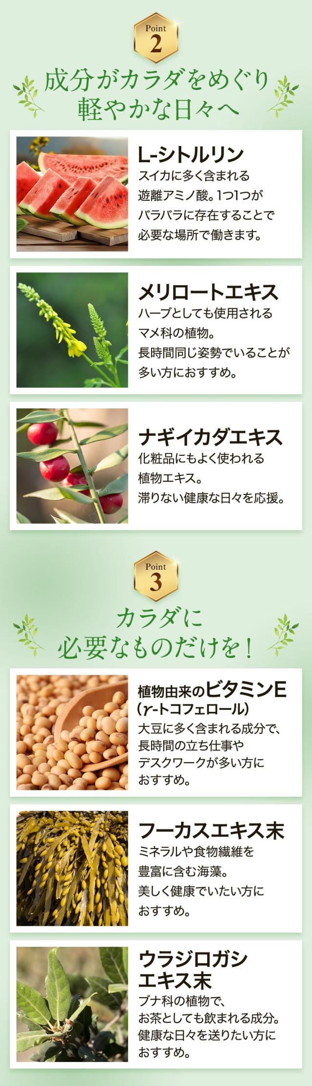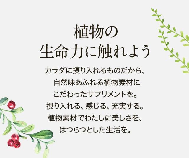 主要原料(1カプセルあたり):クランベリー粉末 100mg / L-シトルリン 50mg / 褐藻抽出物(アクティブファイバー) 50mg / メリロートエキス末 0.25mg