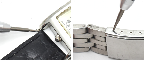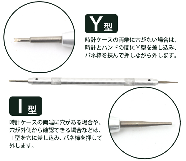 多くの腕時計は、ベルトとケース(文字盤)がバネ棒でつながっています。 本製品の両端が二股になったY型と、先端がφ0.8mmのI型になっています。どちらもバネ棒を押して、ベルトを取り外すために使われます。I型は、根元まで15mmあるためバネ棒を差し込むベルトの穴に穴通しとして使うこともできます。 穴通しをすると、バネ棒を傷めずにスムーズに差し込むことができます。ステンレス製なので、先が曲がることもなく摩耗することもありません。※時計は付属しません。