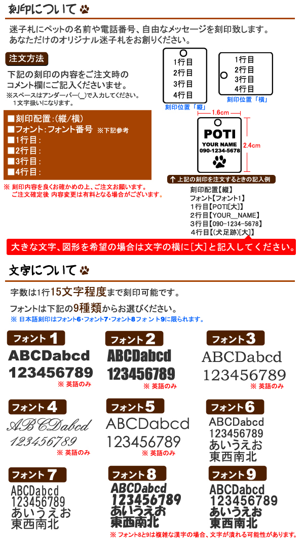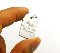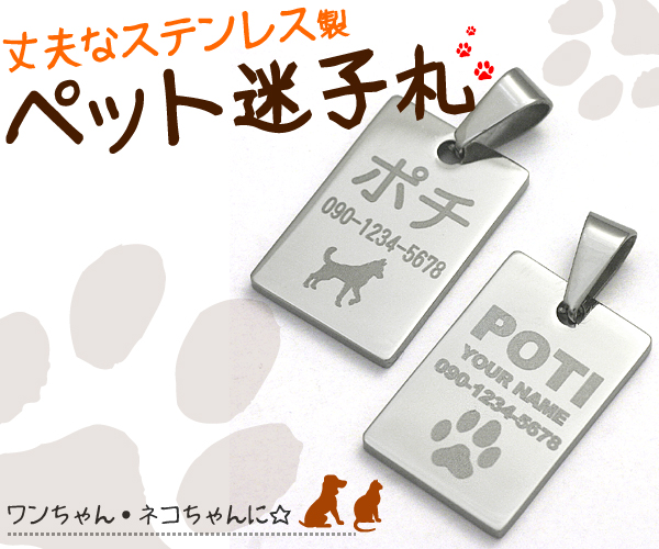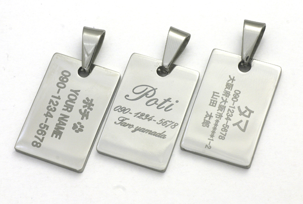 キズに強くよだれなどで酸化もしないステンレス製!文字が自由に刻印できるオリジナルペット迷子札です。大切なペットが迷子にそんな時に頼りになる迷子札!ペットの名前や電話番号、飼い主名や住所などの情報はもちろん、足跡などの図も刻印できて見た目もオシャレ!文字は自由に刻印できるので、オリジナルのストラップやネックレスとしてもオススメです!!印はステンレスの表面をレーザーで彫り込むので、文字が落ちることがありません。