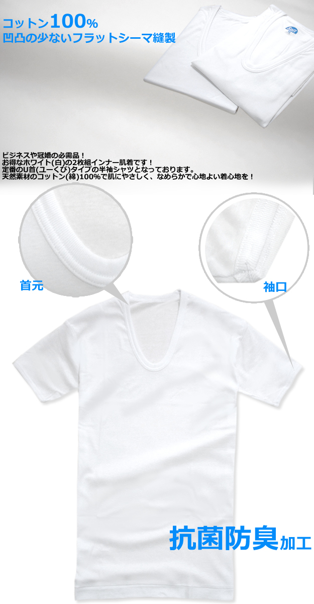 [素材]COTTON(綿)100%[サイズ]M(胸囲88-96 身長165-175)L(胸囲96-104 身長175-185)LL(胸囲104-112 身長175-185)[カラー]ホワイト(白)[生産国]中国/ベトナム/インドネシア[特徴]・U首(ユー首)半袖タイプ・フライス編み(凹凸の少ないフラットシーマ縫製)[商品詳細]ビジネスや冠婚の必需品。お得なホワイト(白)の2枚組インナー肌着です。定番のU首(ユーくび)タイプの半袖シャツとなっております。天然素材のコットン(綿)100%で肌にやさしく、なめらかで心地よい着心地を。M/L/LLから選べます。男のアンダーウェア♪オールシーズン活躍間違い無し。[ご注意]当店ではラッピング等は一切承っておりません。・製品の使用回数、洗濯回数が少ない内は 色移りの可能性が御座います。 白、または色移りのしやすい物との併用、洗濯はお避けください。・商品画像はできるだけ実際のカラーに近づけておりますが、 お客様がお使いのモニターによりましては、 多少色具合が異なって見える場合もございます。 予めご了承ください。[用途]肌着 インナー シャツ トップス綿 コットン cotton 作業着 普段着 無地 シンプルメンズ 紳士 男性 男の子 mens M L LL