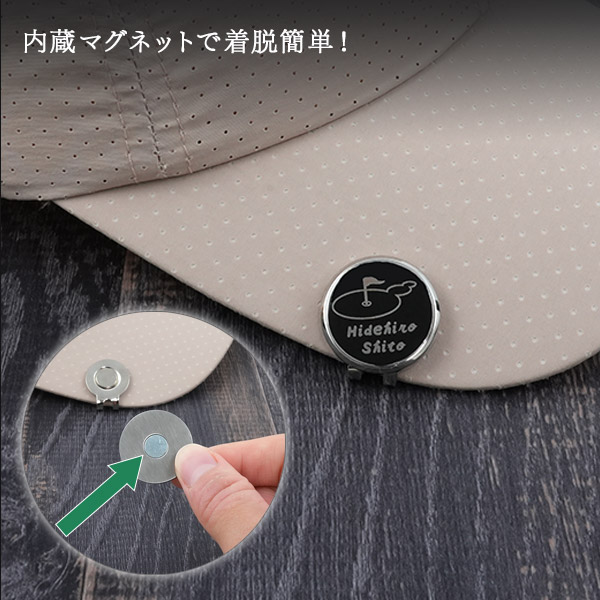 ゴルフマーカー側に磁石が内蔵されており、くっつけられて便利です。