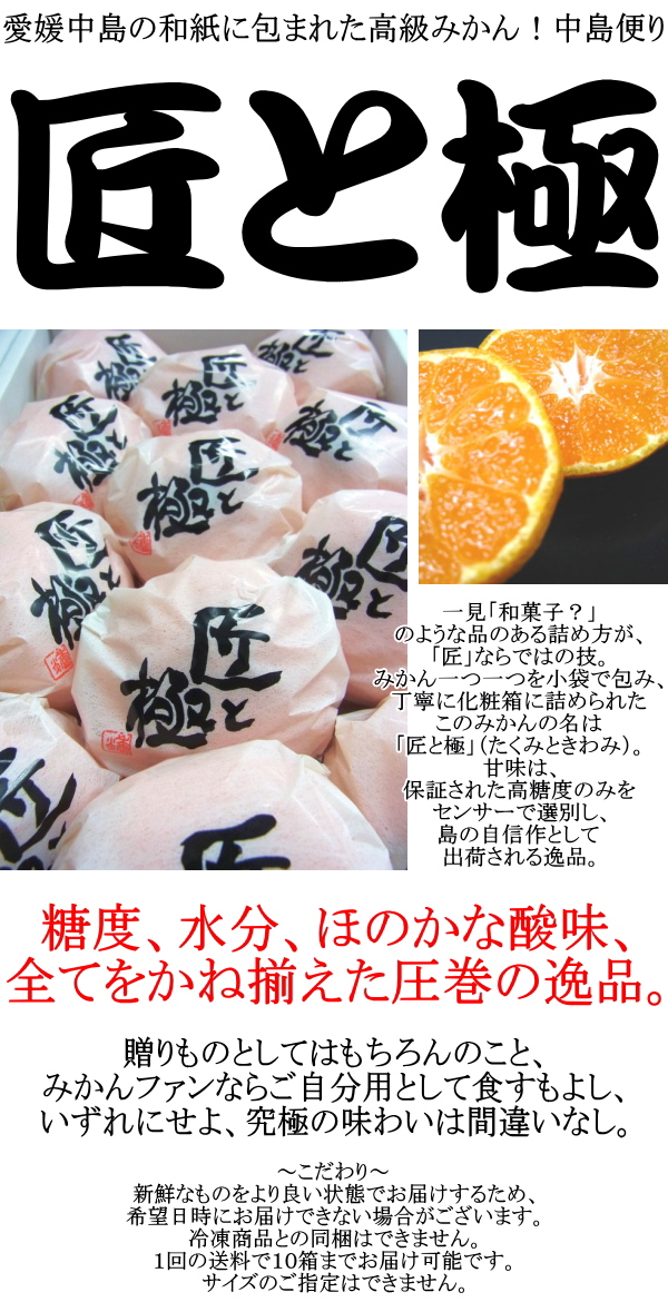 一見「和菓子?」のような品のある詰め方が、「匠」ならではの技。みかん一つ一つを小袋で包み、丁寧に化粧箱に詰められたこのみかんの名は「匠と極」(たくみときわみ)。甘味は、保証された高糖度のみをセンサーで選別し、島の自信作として出荷される逸品。糖度、水分、ほのかな酸味、全てをかね揃えた圧巻の逸品。贈りものとしてはもちろんのこと、みかんファンならご自分用として食すもよし、いずれにせよ、究極の味わいは間違いなし。1回の送料で10箱までお届け可能です。サイズのご指定はできません。1箱約1.5kg:12〜15玉前後