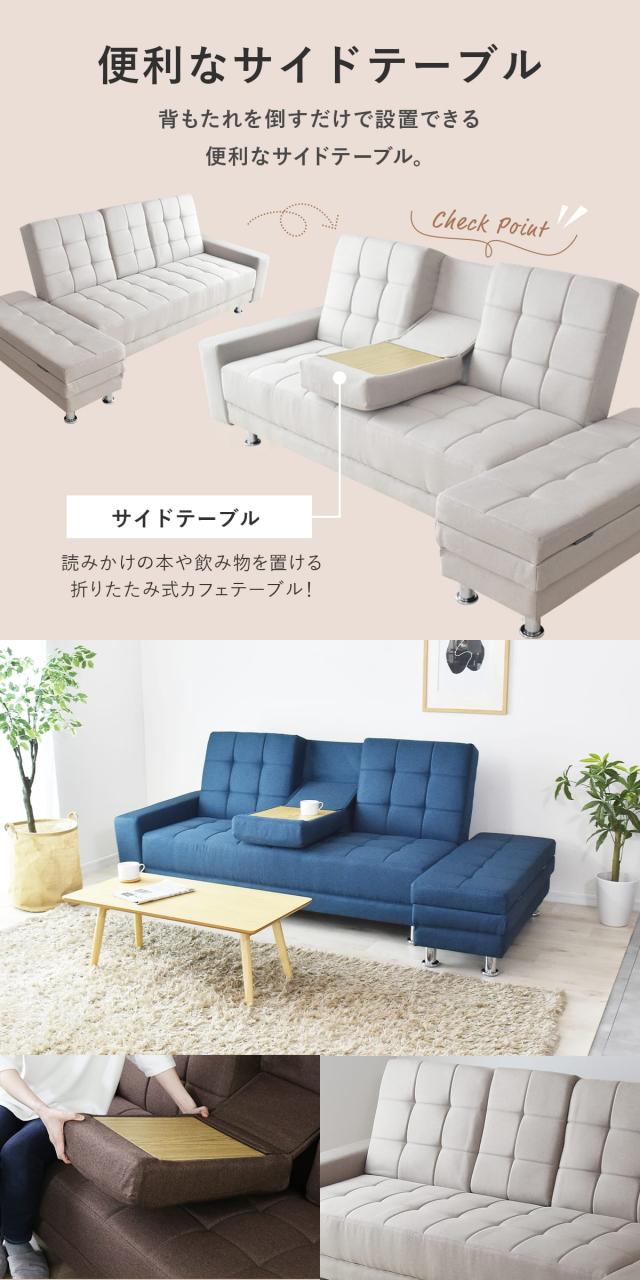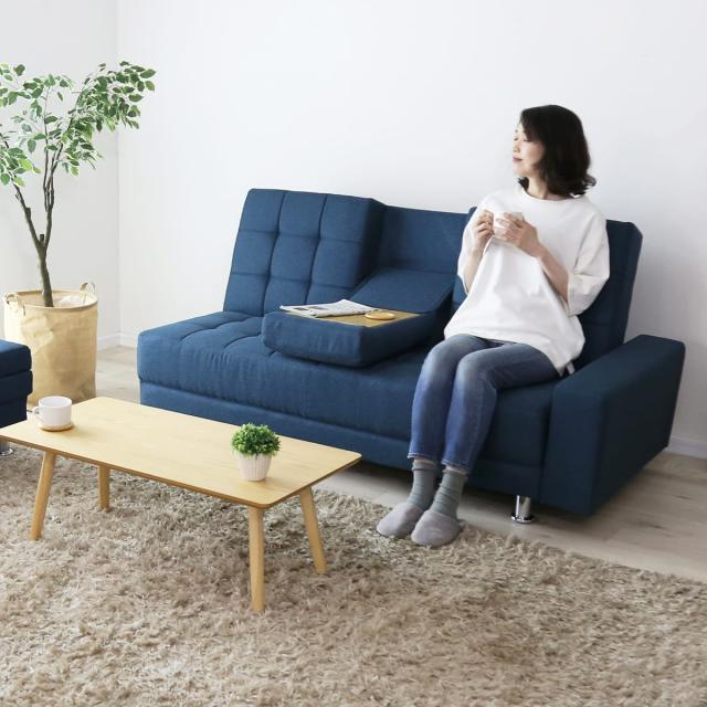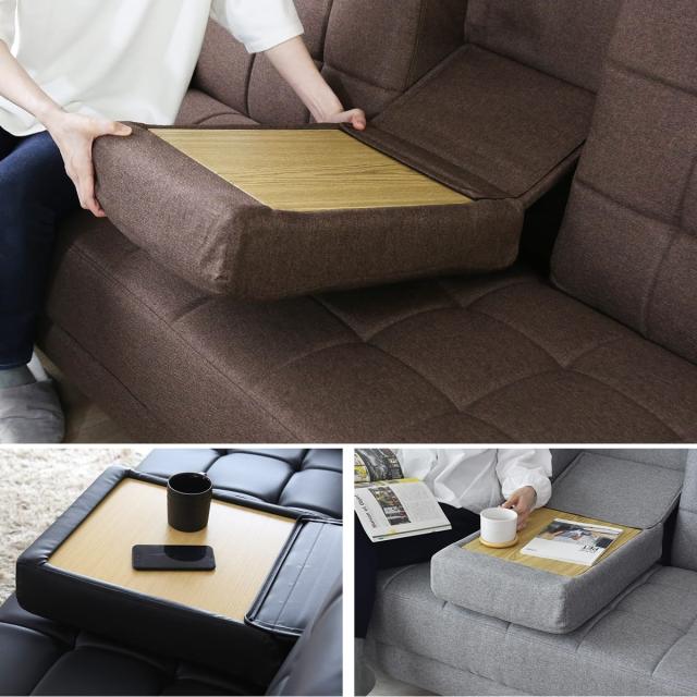ソファ中央の背もたれはサイドテーブルになる設計で、飲み物、スマートフォン、リモコン、小物などをすぐ手の届く位置に置いておけます。天板は汚れが拭き取りやすく、安定感も抜群なので、ちょっとした書き物やパソコン作業にも使える優れもの。「サイドテーブル付きソファ」を探している方にとって、まさに理想的な設計です。家具を追加する必要がないため、省スペースで機能性をプラスできる点も大きな魅力です。