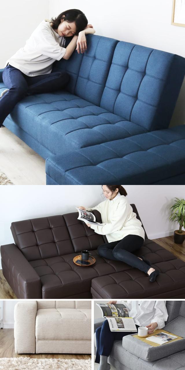 背もたれは3段階のリクライニング機能付き。用途や気分に応じて、角度を自由に変えられるので、ソファとしてのくつろぎ時間がさらに快適に。通常のソファスタイルでは背筋を伸ばしてしっかり座れる角度に。少し倒せば映画鑑賞や読書に最適なリラックスモードに。座る・くつろぐ・横になる、すべてのシーンにフィットする、使い勝手の良い設計で家族みんなが使いやすく、日常使いにとても便利です。