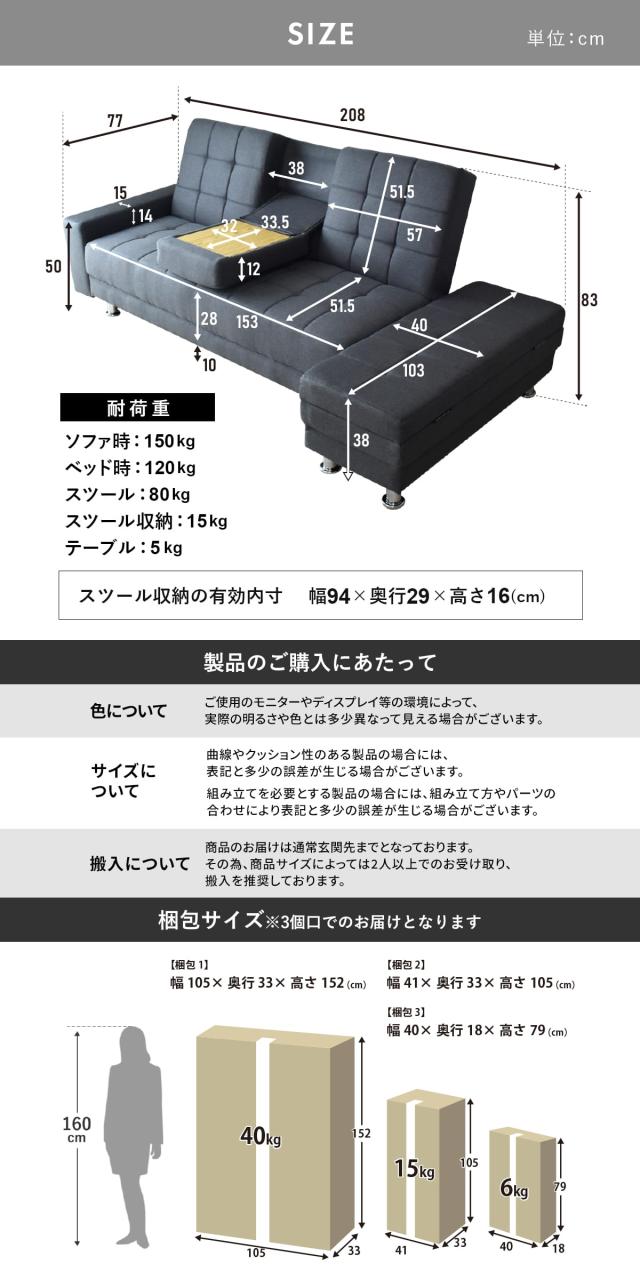 ソファ本体:約幅152〜208×奥行80〜104×高さ38〜80(cm)