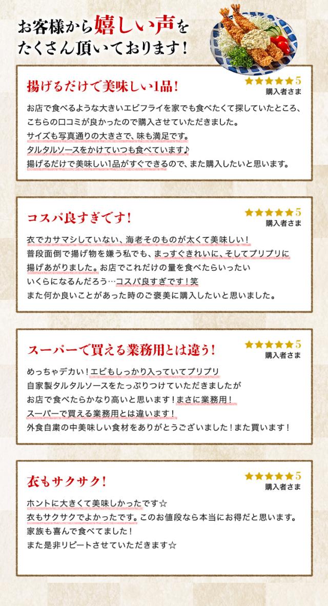 - ほんと揚げるだけ簡単でした、大きいエビで大満足、家族の集まりで数合わせで10尾と合わせて5尾購入、また利用したいです。