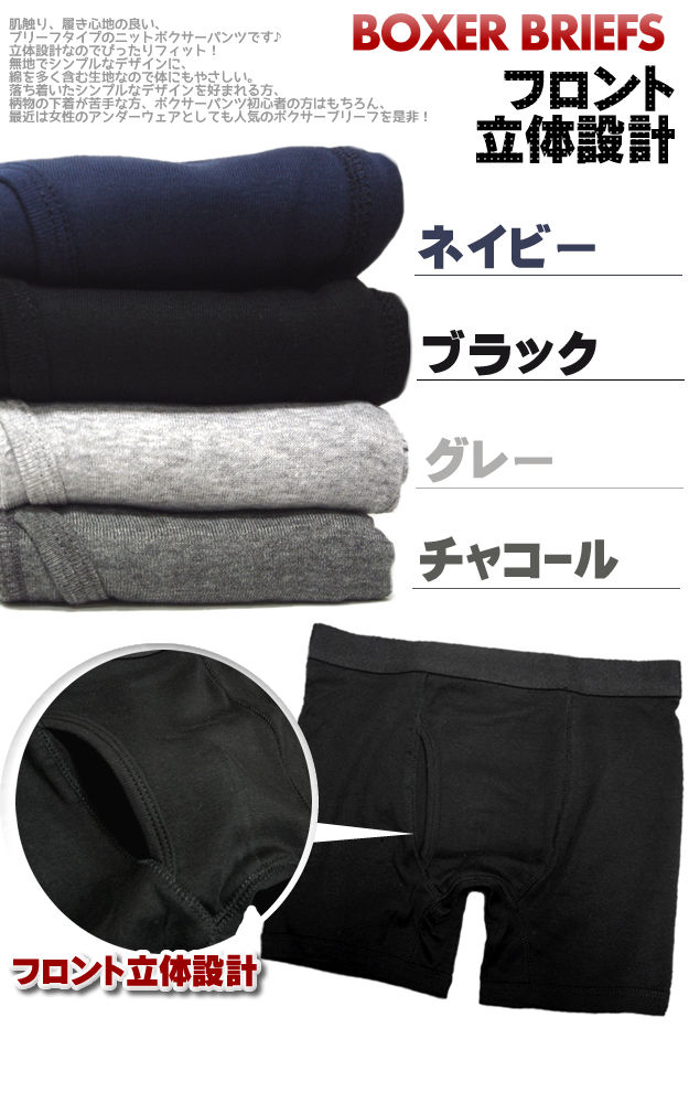 [素材]◆身生地:(グレー・チャコール)綿90レーヨン10%(ブラック・ネイビー)綿100%◆ウエストゴム部分:(共通)ナイロン60ポリエステル40%[サイズ]※実寸サイズは3枚目画像をご覧ください。【サイズ(目安表示)】3L ウエスト98〜108cm4L ウエスト104〜114cm5L ウエスト110〜120cm[カラー]グレー・ブラック・チャコール・ネイビー[生産国]バングラデシュ Bangladesh[特徴]・3D立体設計・前ブリーフタイプ・同じ色の2枚組です。[商品詳細]【MEN'S 2pieces BOXER BRIEFS】肌触り、履き心地の良い、3D立体設計(立体縫製)のブリーフタイプのニットボクサーパンツです♪立体設計なのでぴったりフィット!無地でシンプルなデザインに、綿を多く含む生地なので体にもやさしいニットパンツ。落ち着いたシンプルなデザインを好まれる方、柄物の下着が苦手な方、ボクサーパンツ初心者の方はもちろん、最近は女性のアンダーウェアとしても人気のボクサーブリーフを是非![ご注意]当店ではラッピング等は一切承っておりません。・製品の使用回数、洗濯回数が少ない内は 色移りの可能性が御座います。 白、または色移りのしやすい物との併用、洗濯はお避けください。