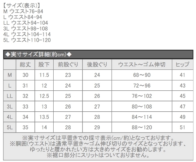 | サイズ | ※実寸サイズは3枚目画像をご覧ください。 【サイズ(目安表示)】 3L ウエスト98〜108cm 4L ウエスト104〜114cm 5L ウエスト110〜120cm |