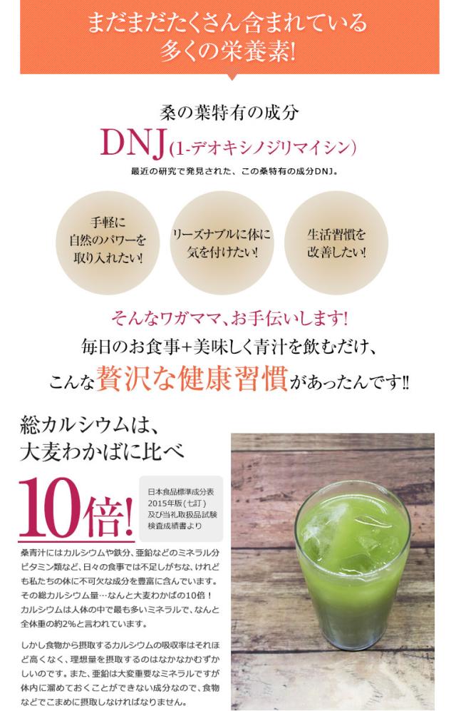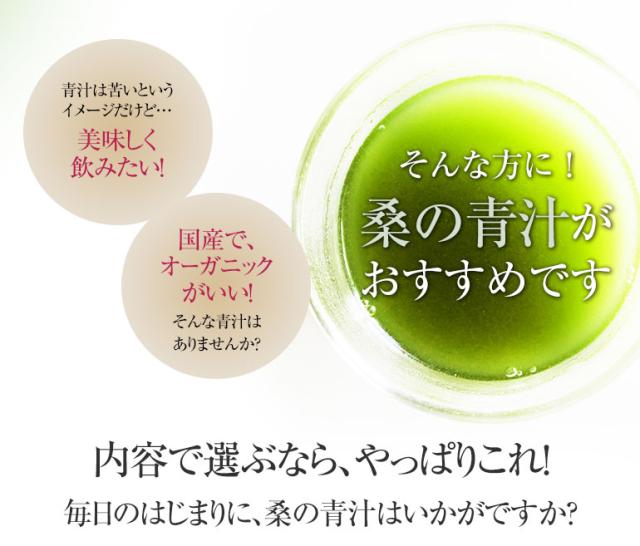 【特徴】青汁が苦手なかたでも大丈夫。子供もゴクゴクと飲める、緑茶風味の美味しくて、安全で、健康に良い桑の青汁です。