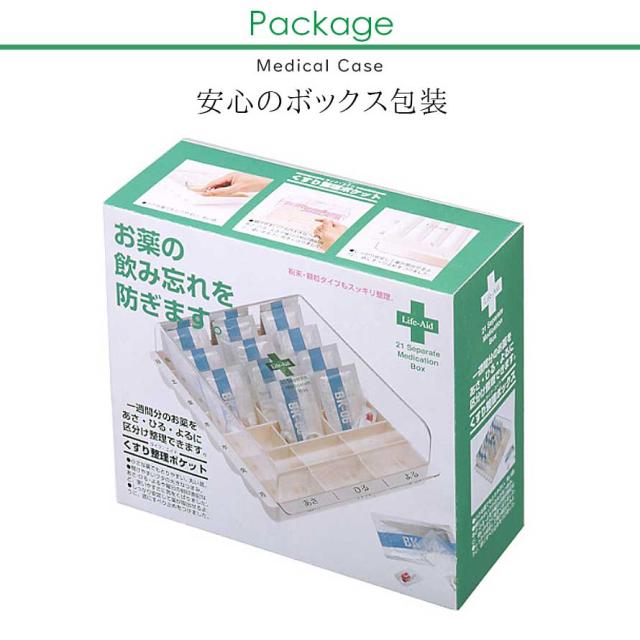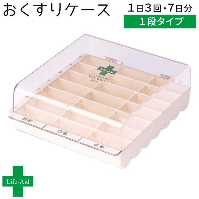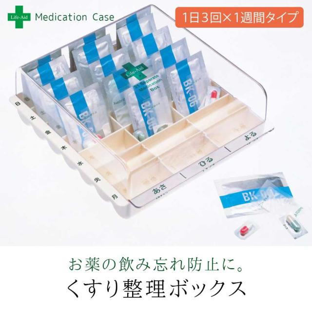 毎日のお薬服用にお役立ちの薬箱。使う人の視点で作られたライフエイドシリーズです。「くすり整理ボックス」は1週間分のお薬を準備しておくことが出来ます。しっかり開け閉めしやすい大きなつまみのフタ。小さな薬でも飲み忘れがないよう、透明素材を採用し、一目で中身が分かります。「あさ・ひる・よる」や曜日のシールをケースに貼ることでで、ちゃんと飲んでいるかの確認もできます。様々な面でお薬を飲まれる方の視点から考えた、飲み忘れを防ぎたい方へお使いいただきたい便利なお薬箱。■商品番号:047170250