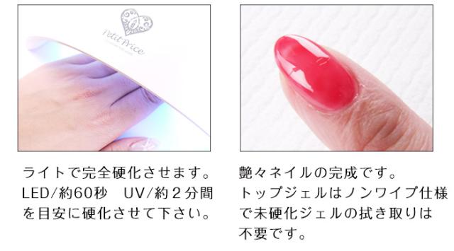 | 注意事項 | トップジェルは、ジェルネイルの仕上げに艶感をアップさせ、 表面をコーティングする液剤です。 塗布した後はライトで完全硬化させてください。 硬化する際に硬化熱が発生します。 熱の感じ方には個人差がございますが、ライトで硬化する際に 熱を感じた場合はすぐにライトから手を出して様子をみながら 少しずつ硬化してください トップジェルはノンワイプ仕様となっておりますので 未硬化ジェルの拭き取りは不要です。 塗布する時は皮膚につかないように、慎重に塗布してください。 トップジェルの成分の影響で、特にホワイト系のカラーの上に トップジェルを使用すると多少黄ばむ場合がございます。 小さなお子様の手の届かない場所で保管してください。 |
