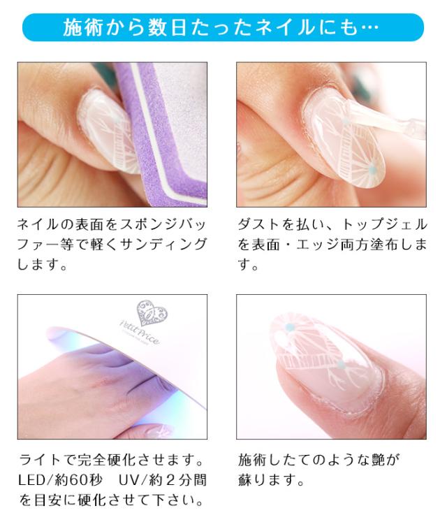 お得な3本セット★ ジェル特有の臭いを大幅軽減! 独自処方により従来品の不快な臭いを大幅にカット。 ネイル中のストレスを感じさせず、光沢や持ちもプロ仕様のまま。 是非お試しください。 [完全硬化の目安:48wライトで約60秒] 未硬化ジェルが残らないため、抜群のサロンのようなツヤがでます。 簡単にツヤ感アップできるのが嬉しい商品。 |