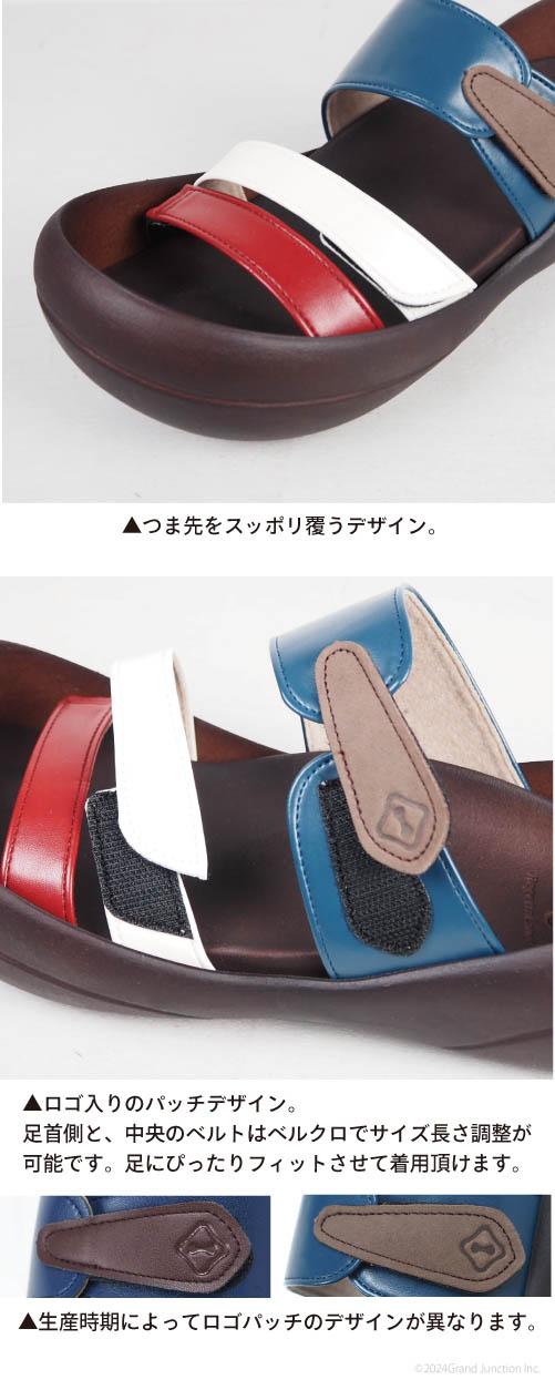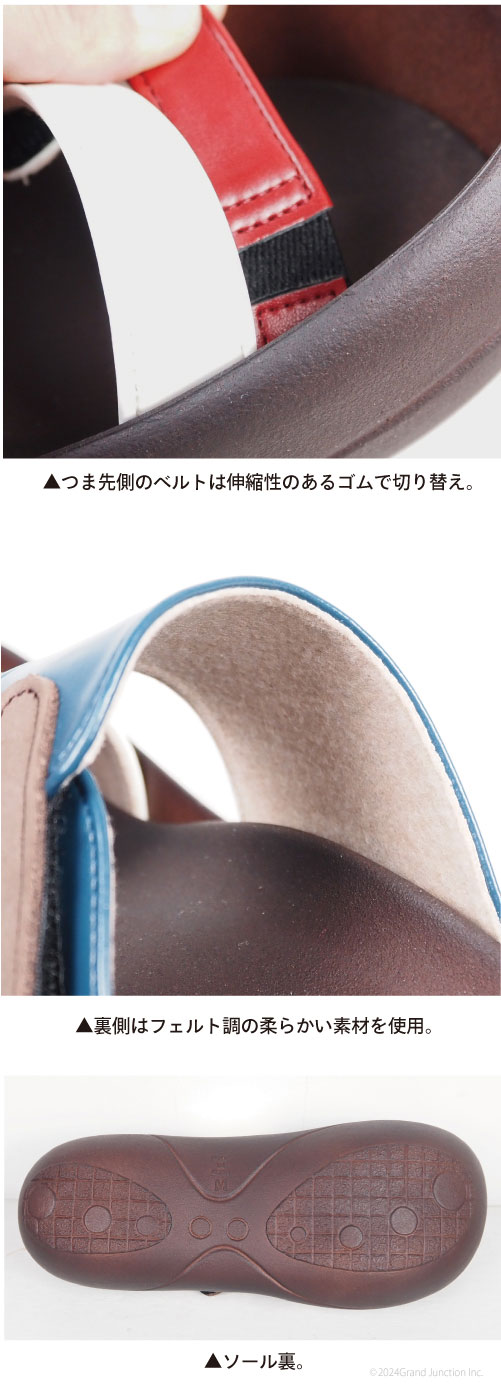 つま先側のベルトはゴム切り替えがされ、残り2本のベルトはマジックテープで調節可能!足の形に合わせやすく、甲高の方も安心です。