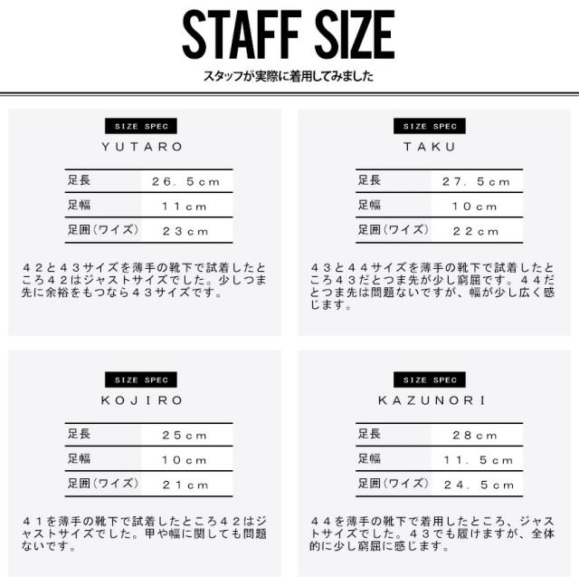 Koutaro:身長181cm 体重65kg 44(27〜27.5cm)サイズ着用Ami:身長174cm 体重55kg 42(26〜26.5cm)サイズ着用