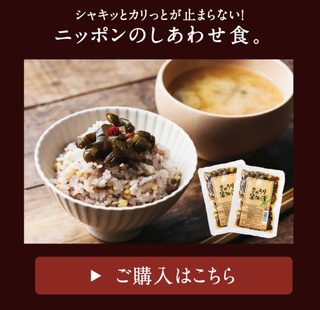 原材料:きゅうり(宮崎産)、生姜、漬け原材料(砂糖、醤油、唐辛子、白いりごま、かつおエキス、醸造酢、発酵調味料)、調味料(アミノ酸等)、酸味料、醸造酢)