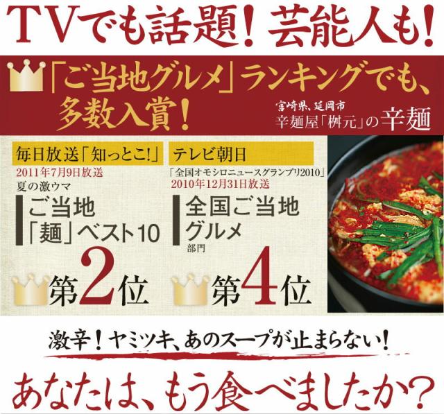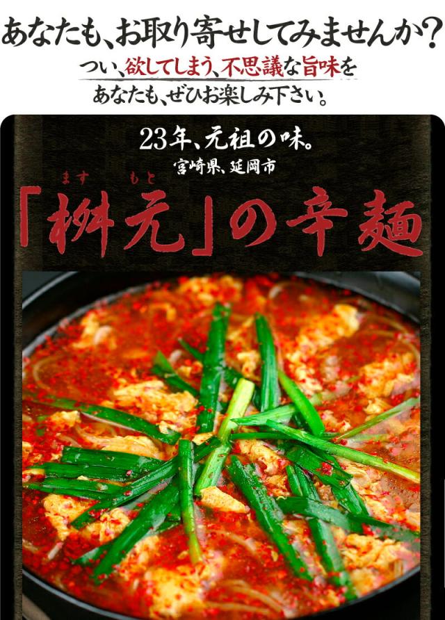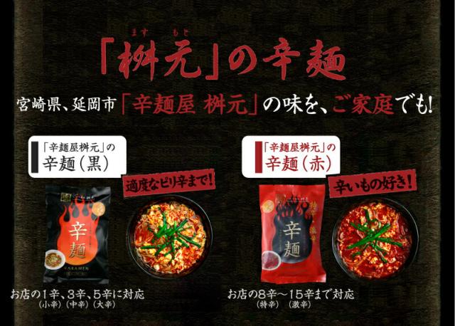3種類の味から選べる宮崎元祖辛麺屋 桝元-ますもと ラーメン2食セット 辛麺 激辛 豆乳の3種類。辛さを極め、旨さを極めた一杯。魚介のスープに2種の唐辛子を合わせた醤油ベースの「辛麺」 agesugi_sgu
