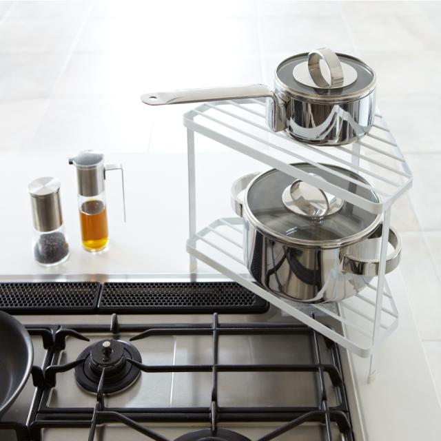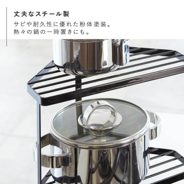 コンロのコーナーに置いて調理中の鍋や調味料などを置いておける便利なキッチンコーナーラックです。コンロ以外にもキッチンの収納棚としても使えて便利です。