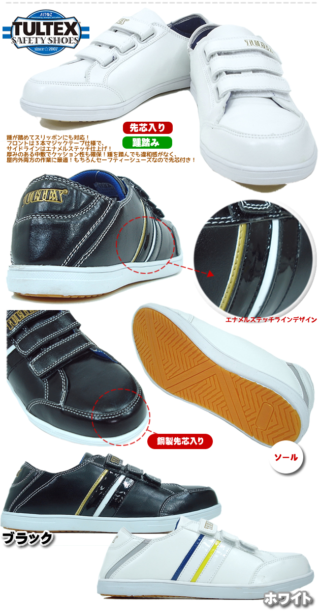 | 踵が踏めてスリッポンにも対応!フロントは3本マジックテープ仕様で、サイドラインはエナメルステッチ仕上げ!厚みのある中敷でクッション性も確保!踵を踏んでも違和感がなく、屋内外両方の作業に最適!もちろんセーフティーシューズなので先芯付き! | ||||||