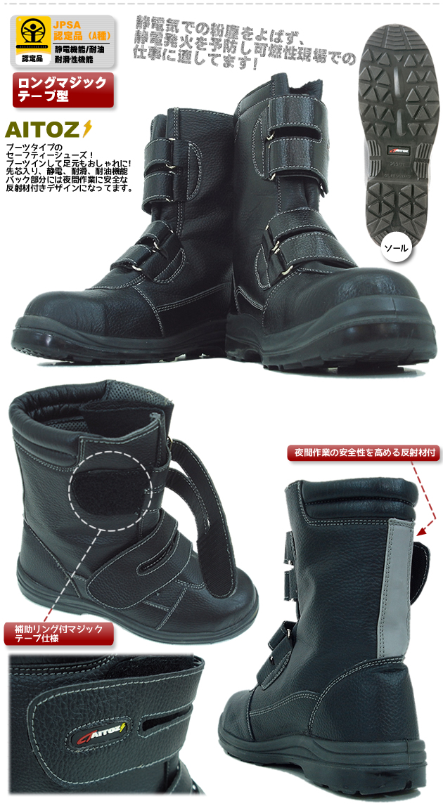 | 反射材付きで夜間作業も安全!静電気で粉塵も寄せ付けないセーフティーブーツ!止め部分はロングマジックテープ型タイプ!銅先芯入り、静電、耐滑、耐油機能。可燃性現場での仕事に適したシューズです! | ||||||