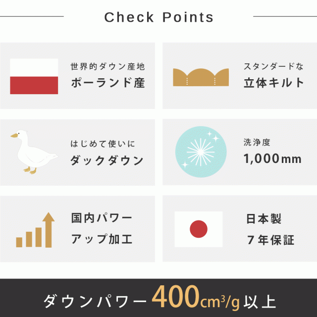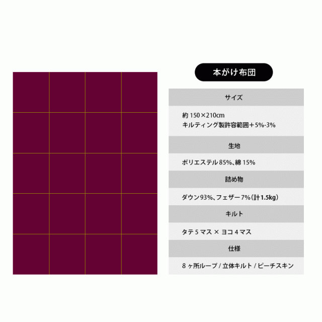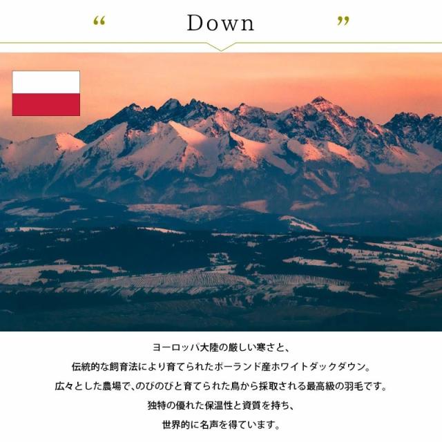 | 詰め物 | ポーランド産ホワイトダック ダウン93%、フェザー7%(合計1.5kg) |