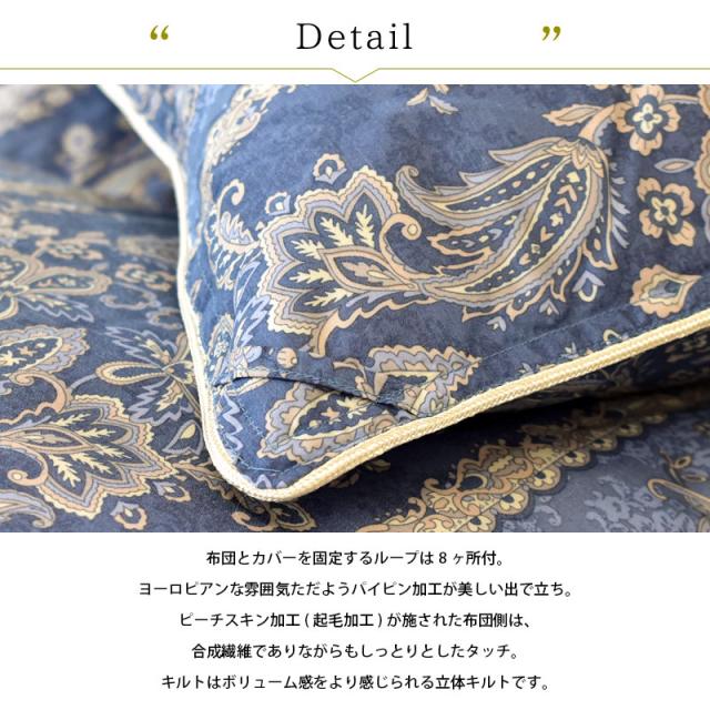 | 仕様 | 国内パワーアップ加工 ピーチスキン加工 パイピン加工 8ヶ所ループ 裏表同柄プリント ロイヤルゴールドラベル付 横4マス×縦5マスキルト |