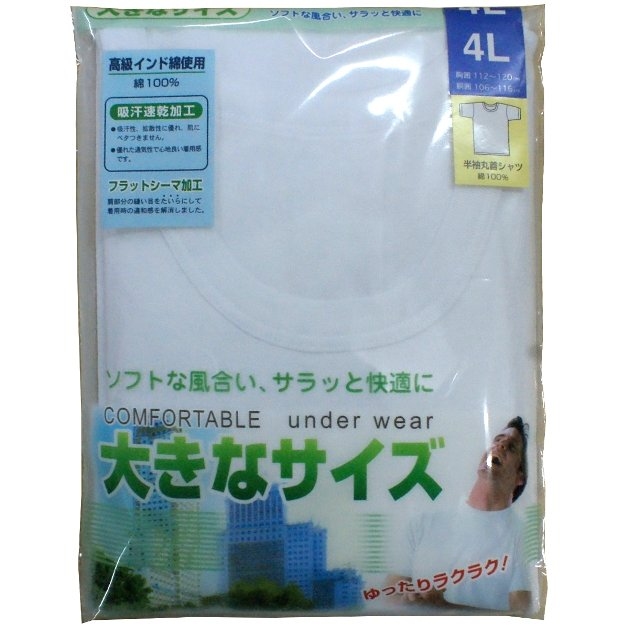 4Lサイズ 丸首半袖肌着シャツ 綿100%(高級インド綿使用) 紳士/インナーシャツ