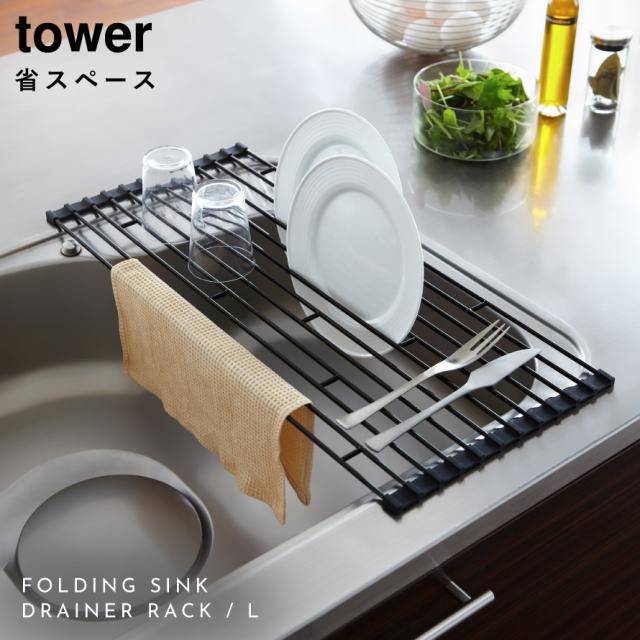 水切りラック スリム 折りたたみ シンク上 水切り ラック コンパクト キッチン キッチン収納 タワー tower TOWER ブラック ホワイト 白 黒 山崎実業 モノトーン シンプル インテリア スタイリッシュ おしゃれ 折り畳み水切りラック タワー L