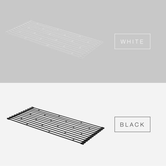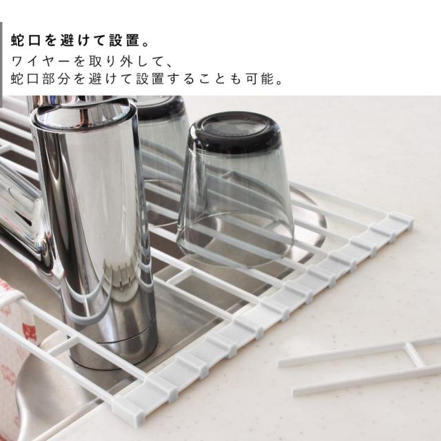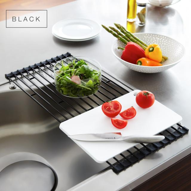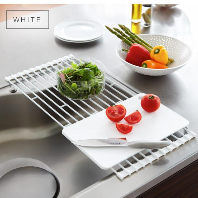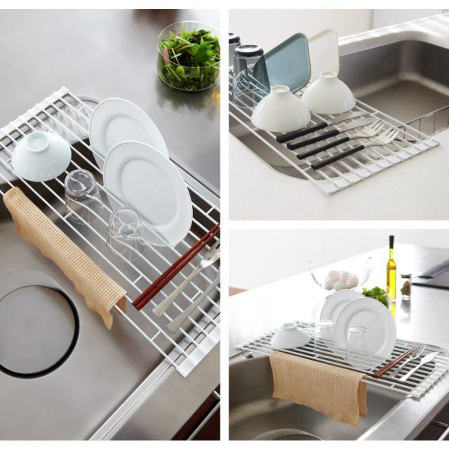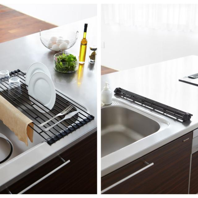 クルッと巻いて省スペースに収納。便利な折り畳み水切りラック。シンクのスペースを有効活用でき、調理スペースが広く使え、台所仕事がより快適になります。