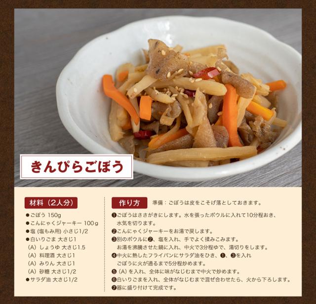 お酒に合う甘辛い醤油味のおつまみに仕上げました。薄くスライスしているので、こんにゃくの噛み応えと甘辛い味付けが後を引き、お酒が進むおいしいおつまみです。