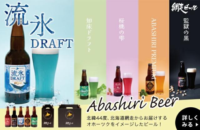開業以降、帆立・牛乳その他様々な副原料を用いた発泡酒を開発。そのノウハウを活かして冬の網走を代表する流氷を仕込み水に使用した「オホーツクブルー」色の発泡酒「流氷DRAFT」を平成20年2月に発売しヒット商品となりました。 以降、世界遺産知床の新緑の季節をイメージした「知床DRAFT」、網走産の麦芽を100%使用した「ABASHIRIプレミアムビール」、など、様々なビールを発表し続けています。 |