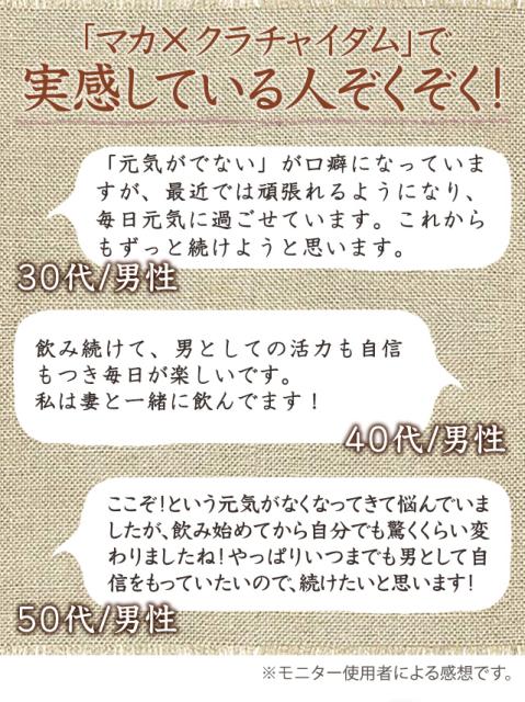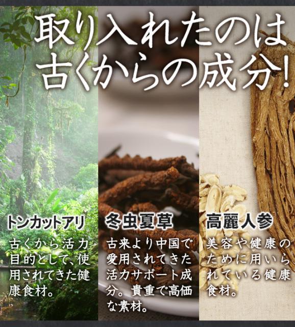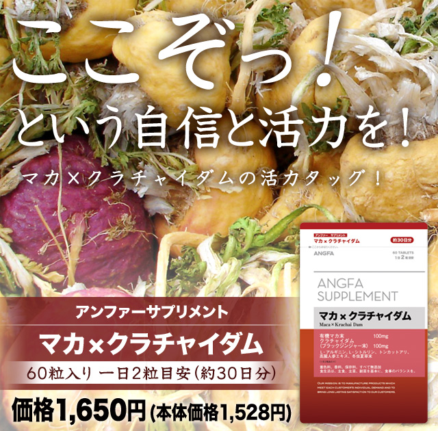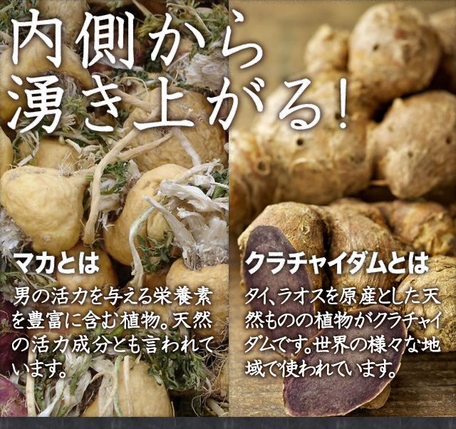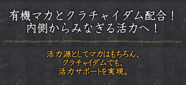 また、マカ以上のアルギニン量を誇るクラチャイダムを100mg加えることで、男性活力のサポートを追求したサプリメント。