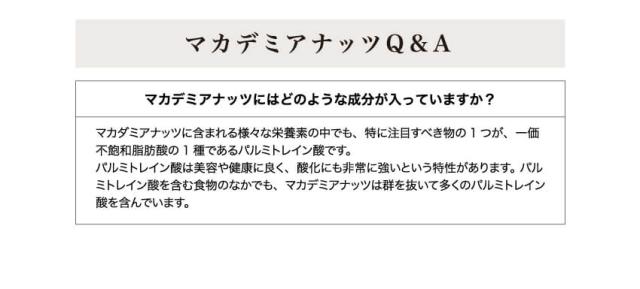 マカデミアナッツは、ヘルスサポートとして人気が高く、欧米では「テーブルナッツ」としてマカデミアナッツが置かれ、食べる習慣が根付いています。「栄養の宝庫」と呼ばれる程、脂質やたんぱく質、ミネラルや食物繊維など栄養や美容・健康成分がたっぷりつまっており、体の疲れやお肌の疲れをケア!