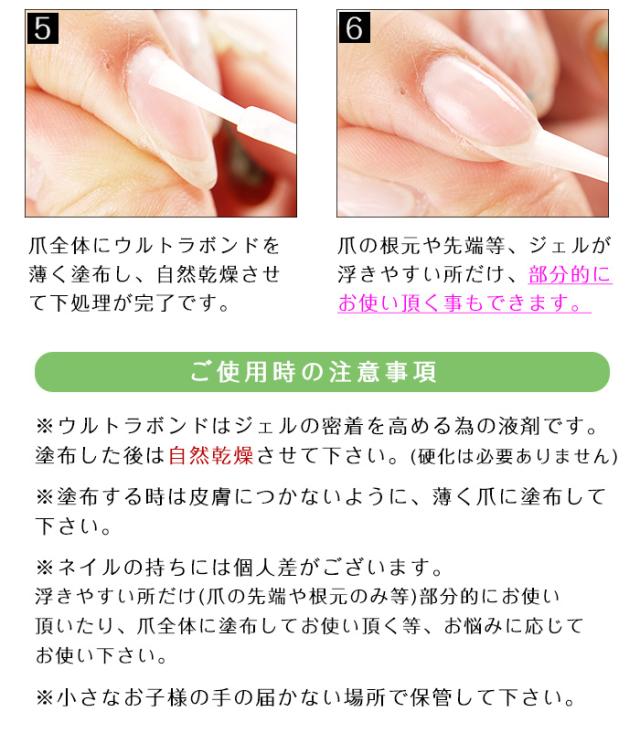 | 注意事項 | ウルトラボンドはジェルの密着を高めるための液剤です。 塗布した後は自然乾燥させてください(硬化は必要ありません) 塗布する時は皮膚につかないように、薄く爪に塗布してください。 ネイルのもちには個人差がございます。 浮きやすいところだけ(爪の先端や根元のみ等)部分的にお使いいただいたり、 爪全体に塗布してお使いいただく等、お悩みに応じてお使いください。 小さなお子様の手の届かない場所で保管してください。 |