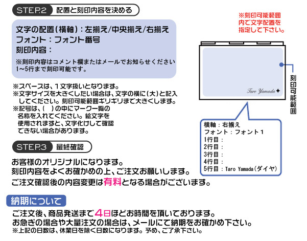 ◆刻印内容は、ご注文時にお店へのご要望欄へご記入いただくか、メールでお知らせください。