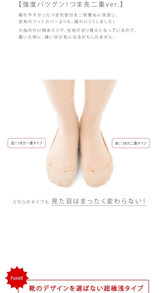 - つま先二重の黒を購入。 ホントに脱げにくいのは感動しました、が! パンプスに合わせたら丸見えになってしまいました…残念。