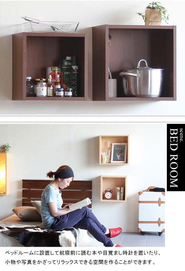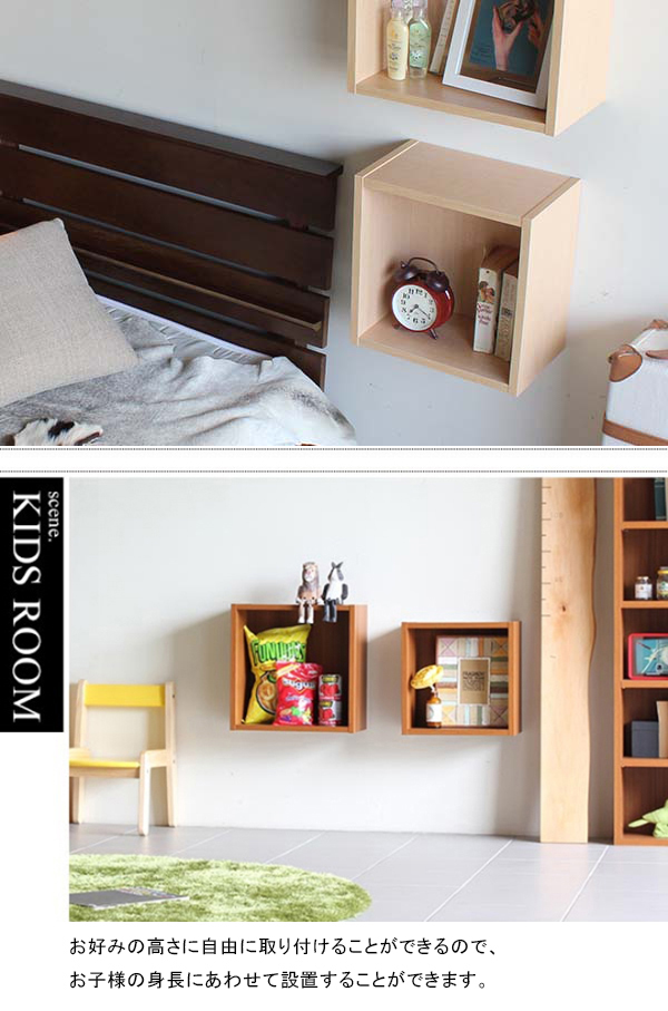 壁に掛けるタイプのキューブボックスなので、お部屋に圧迫感を与えず手軽に収納スペースを増やせる棚です
