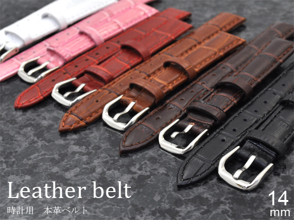 交換用にオススメな、時計用本革ベルト。ラグ幅14mmの本革のベルトです。また、バネ棒・尾錠も付属しています。 ブラック、ホワイト、ブラウン、ダークブラウン、ピンク、レッドの6色からお選びいただけます。