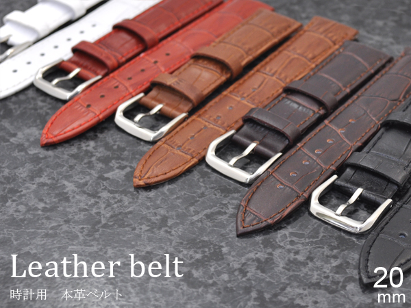 交換用にオススメな、時計用本革ベルト。ラグ幅20mmの本革のベルトです。また、バネ棒・尾錠も付属しています。 ブラック、ホワイト、ブラウン、ダークブラウン、レッドの5色からお選びいただけます。