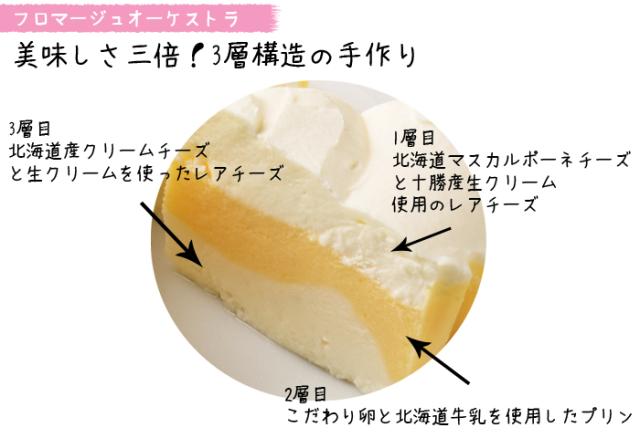 メレンゲを使用したフワフワ食感が特徴のかご盛レアチーズケーキ。3層構造が特徴の2004年北海道加食品コンクール優秀賞受賞のフロマージュオーケストラ。