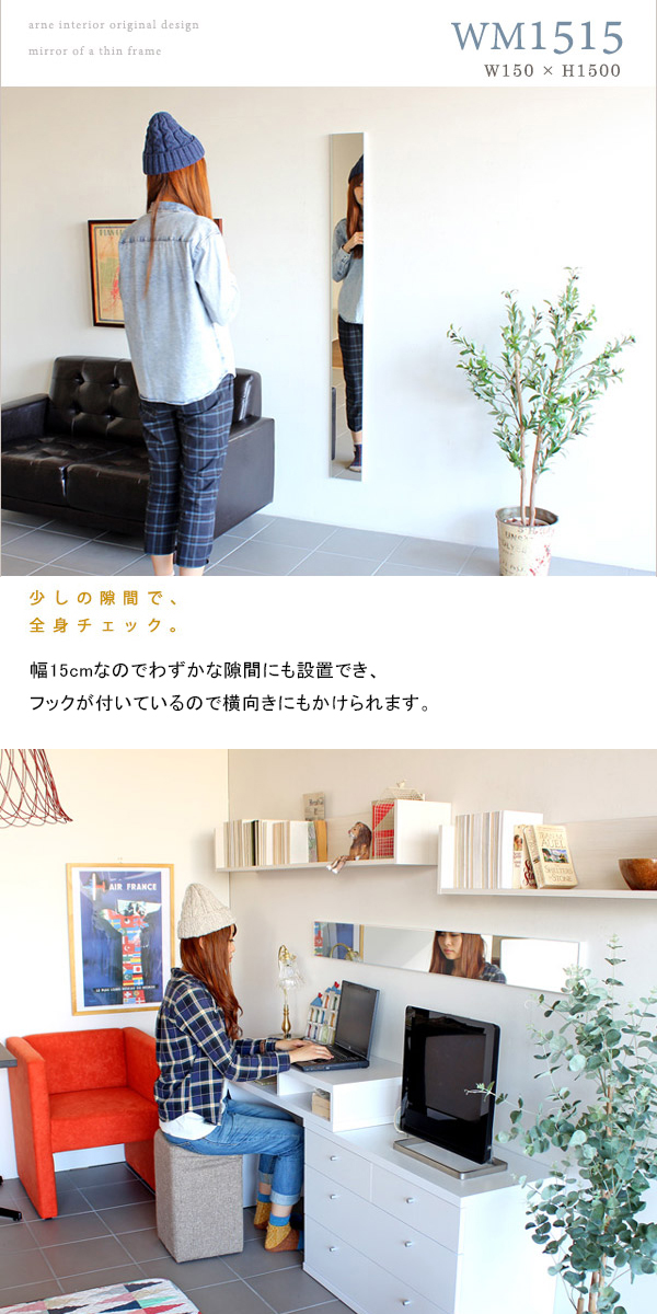 ウォールミラー 軽量 フック 150 スリム ミラー 鏡 全身鏡 壁掛けミラー おしゃれ 全身 壁掛け鏡 白 幅15 WM1515 ▼