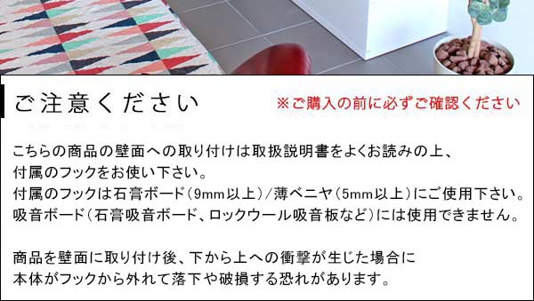 付属のフックは石膏ボード壁専用です。商品の落下により発生した損害に対して当店は一切責任を負いかねますので、十分ご検討の上ご使用ください