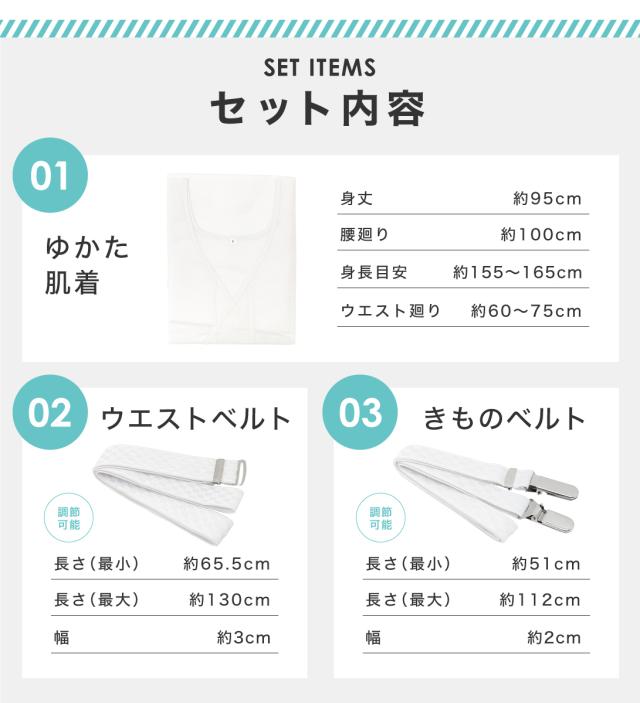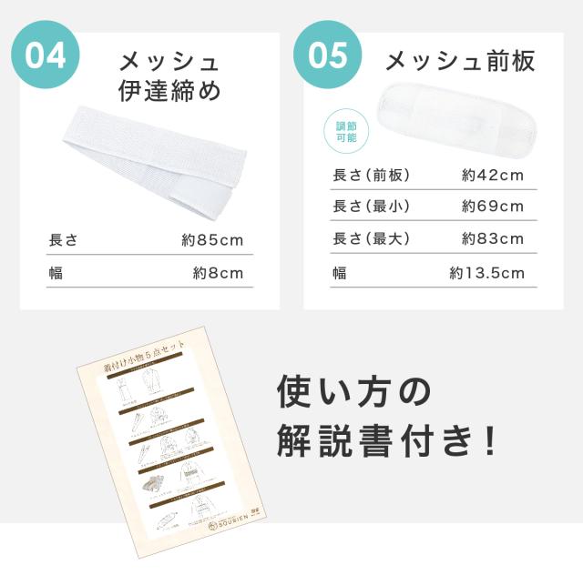 セット内容は【ゆかた肌着、ウエストベルト、きものベルト、メッシュ伊達締め、前板】の5点セットになります。
