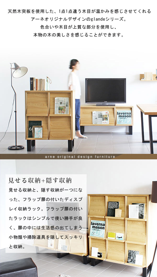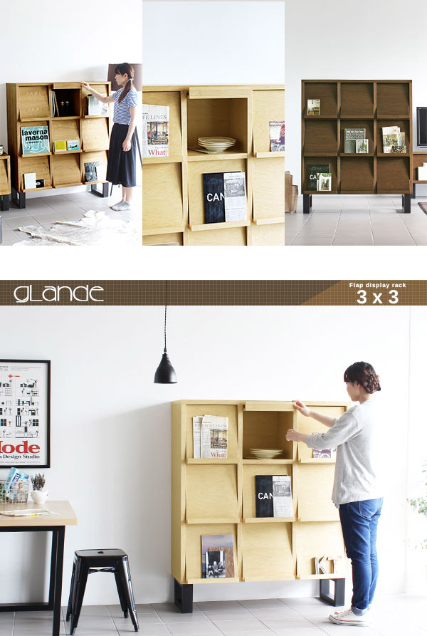 フラップチェスト 3段 リビング 本棚 おしゃれ 扉付き キャビネット ディスプレイ マガジンラック 木製 glande 3×3 ◎