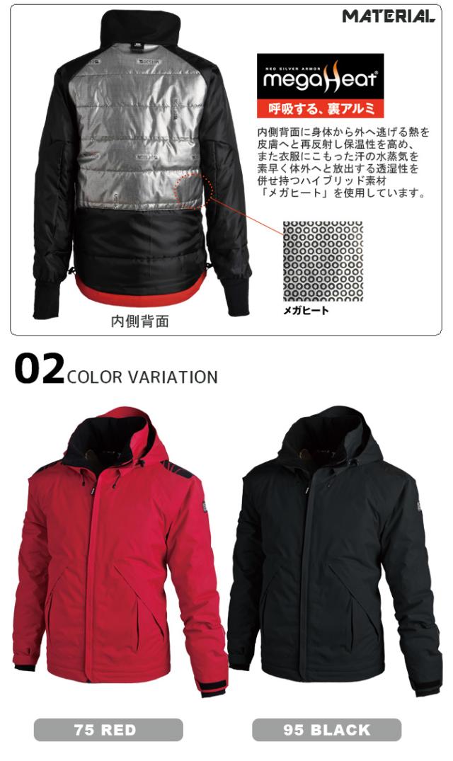 | 多くのワークマン達から熱い支持を受けるTOWAの「TS DESIGN」ブランドから秋冬用ジャケットのご紹介です! 一番の特徴は、身体から外へ逃げる熱を皮膚へと再反射し保温性を高め、また衣服にこもった汗の水蒸気を素早く体外へと放出する透湿性を併せ持つハイブリッド素材「メガヒート」を使用している点です。 内側背面に大きくメガヒート素材を使用し、ごわごわしない薄手中綿ジャケットでも、高レベルの保温性を発揮します。 また、腕には暗い場所で光を反射するプリントが施されています。 フードはヘルメットの上からでも被れるゆったりした作り。 肩には滑り止め素材付きで、荷物を運ぶときに肩のスレを保護してくれます。 | ||||||