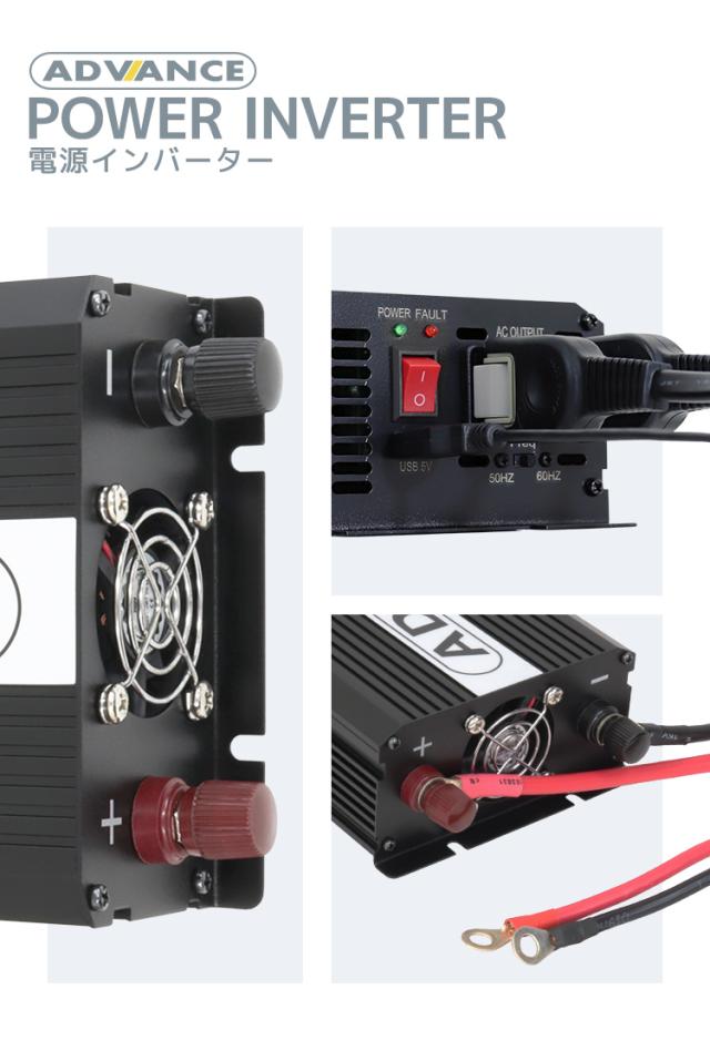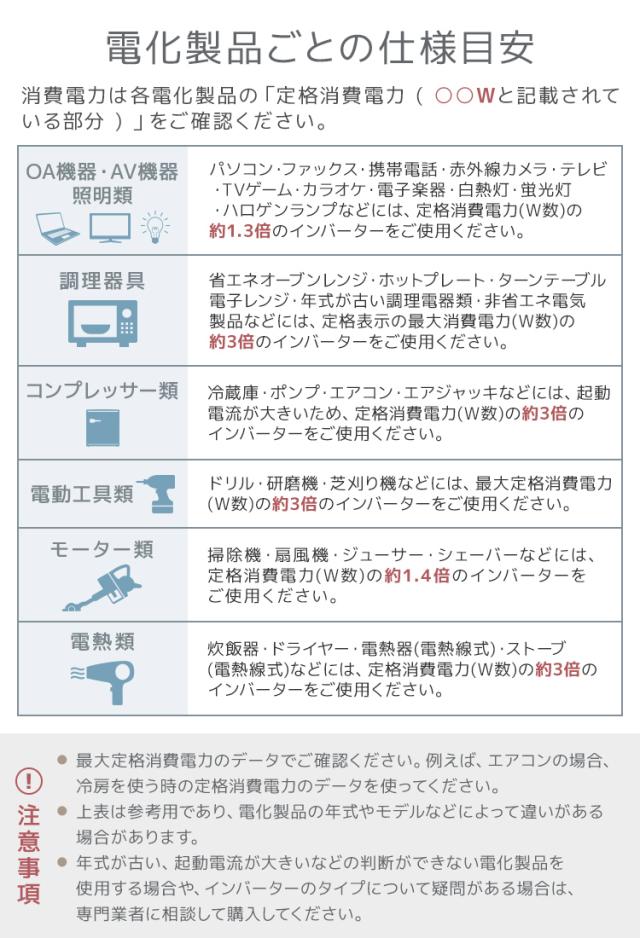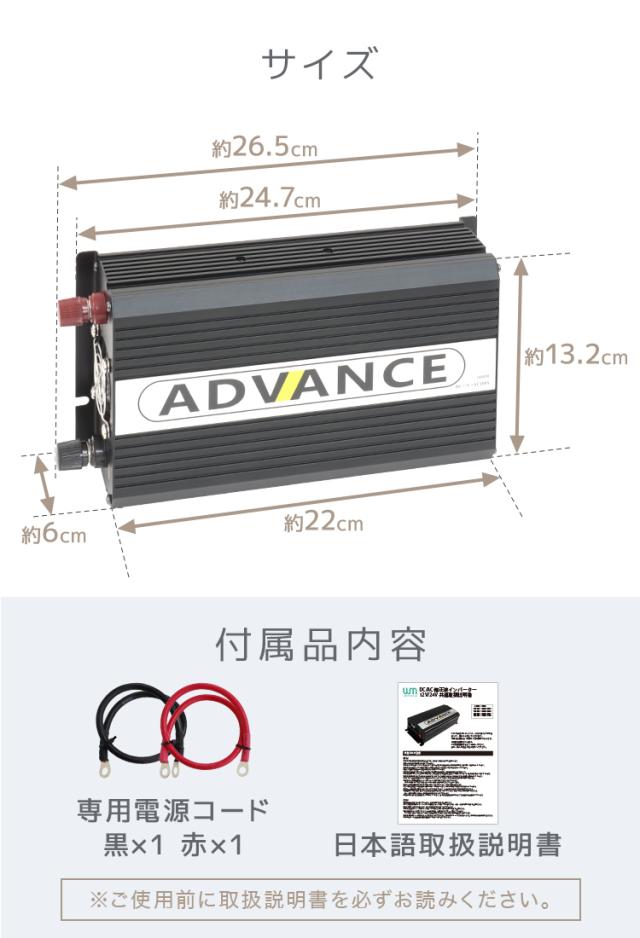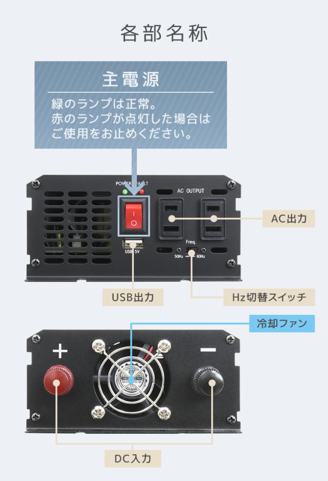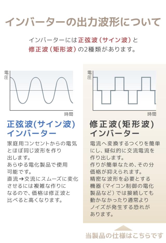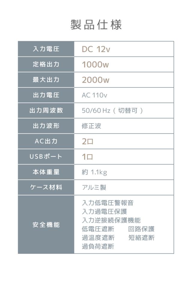 | 商品仕様 | 寸法:260mm(L)×135mm(W)×65mm(H) AC100Vコンセント ×2 USBポート ×1 入力電圧:DC12V 出力電圧:AC100V 定格出力:1000w 最大出力:2000w 出力周波数:スイッチで50Hz/60Hz 変換可能 出力波形:矩形波(疑似正弦波) ケース:アルミ製 |