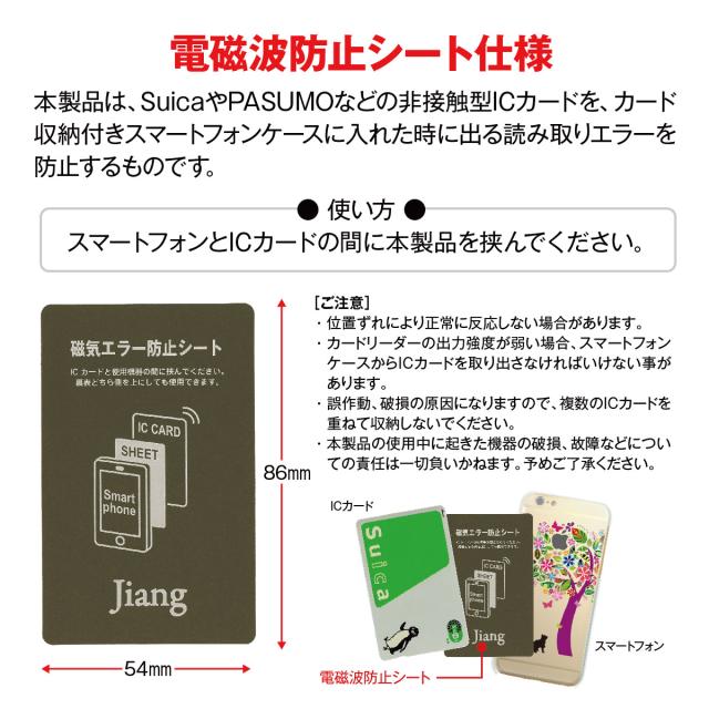 本製品は、SuicaやPASUMOなどの非接触型ICカードを、カード収納付きスマートフォンに入れた時に出る読み取りエラーを防止するものです。