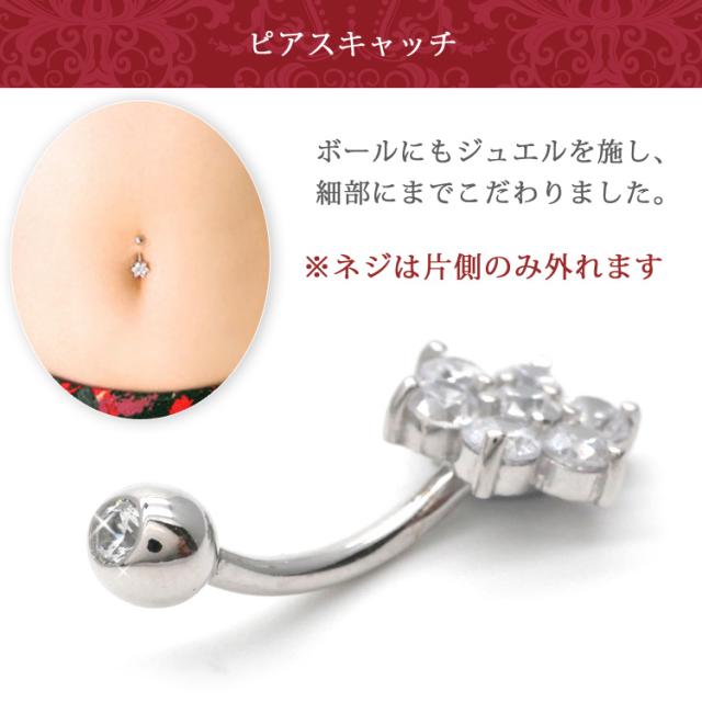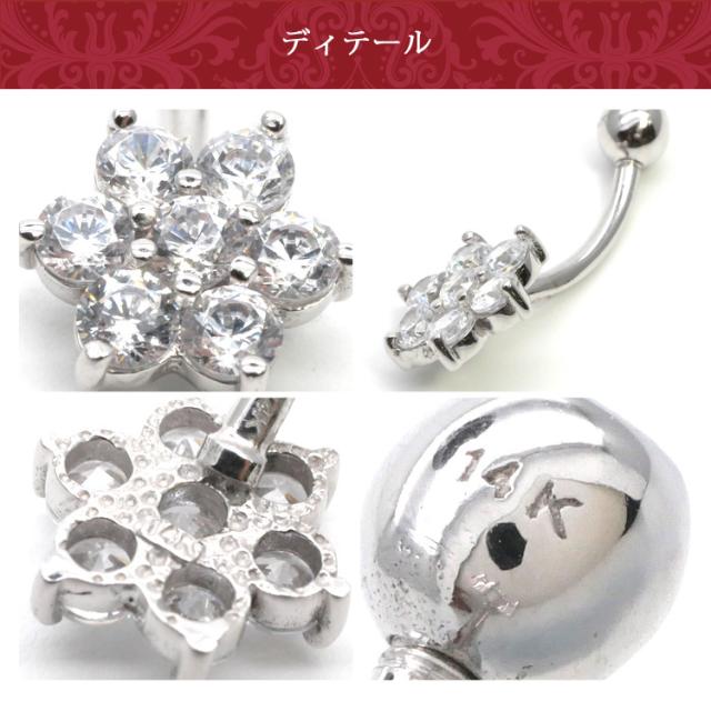 最高級の素材14金ホワイトゴールド製の贅沢なへそピアスです。散りばめられた立爪の7粒のクリスタルが雪の結晶のようにキラキラ輝きます。もちろんホワイトゴールドの贅沢な耀きも加わり最高の一品となること間違いなしです。おへそピアスにはもちろん、耳たぶピアスにもご使用いただけます。太さのサイズはへそピアスでよく使用される14Gとなります。本物のゴールドの輝きを是非一度ご体感ください。