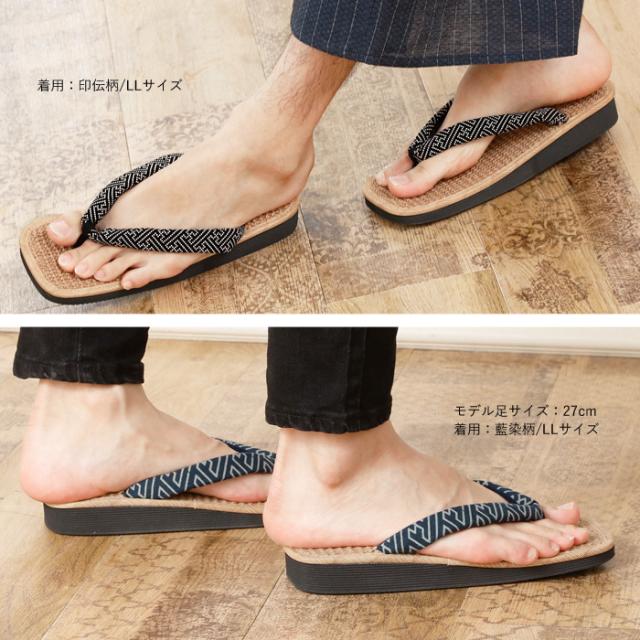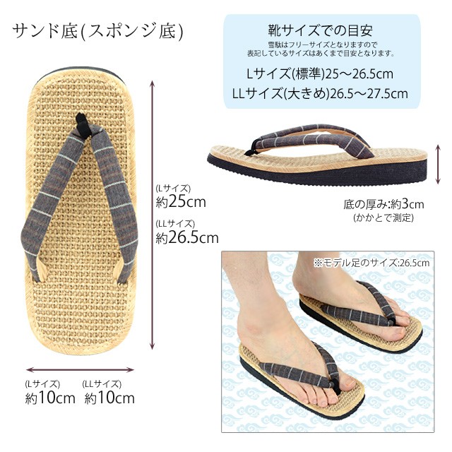 | ※鼻緒の柄はお選びいただけませんのでご注意ください。 ゴツゴツした表面は足裏にほどよい刺激で足ざわり抜群! 天然繊維の中で最も吸汗・速乾性に優れた素材の麻を使用! 汗をかきやすい暑い日でも快適な足元に♪ 日本の職人さんが作った、細かいところまで丁寧な仕上がりです。 ■ブランド:竹春(TAKEHARU) ■生産地:日本 ■実寸サイズ Lサイズ:(約)縦25×横10cm、かかとの高さ3cm LLサイズ:(約)縦26.5cm×横10cm、かかとの高さ3cm 3Lサイズ:(約)縦27.0cm×横10.5cm、かかとの高さ3cm 4Lサイズ:(約)縦28.7cm×横11.0cm、かかとの高さ3cm ※すべて手作業での採寸のため、若干の誤差が生じる場合がございます。 ■適応サイズ(目安) Lサイズ(標準):25.5〜26.5cm LLサイズ(大きめ):26.5〜27.0cm 3L:27.5cm〜28.0cm 4L:28.0〜29.0cm 雪駄はフリーサイズとなりますので、表記しているサイズはあくまで目安となります。 履き始めは鼻緒が窮屈に感じられますが、履き込むほど鼻緒が程よく伸び、足に馴染んできます。 【履き方のコツ】 履き始めは鼻緒が固く履きにくさを感じるかと思いますので、鼻緒の後ろや先坪の部分を軽くひっぱり、鼻緒を指で押しつぶして(ほぐして)柔らかくすると履きやすくなります。 ※無理に強い力で引っ張ると鼻緒が抜ける恐れがございます。 雪駄を履く時は親指と人指し指の間に余裕を持たせ、かかとが少し飛び出るくらい浅めに履くと鼻緒で指の間を痛めにくいです。 歩く際には重心が前になるように意識する事がコツです。 【サイズ選びのポイント】 雪駄は本来、かかとを少し出して履くのが一般的な履き方とされております。 履いていてかかとが痛くないほどの出方がちょうど良いサイズです。 サンダルとしてお使い頂く場合や、かかとをおさめて履きたい場合はワンサイズ上の商品ををおすすめします。 【長く使うためのコツ】 雪駄には左右がありませんので、時々左右を履き替えて頂くと長持ちします。 <ご注意> ・鼻緒の柄は当店お任せとなります。予めご了承ください。 ・商品は防水されておりません。カビなどの原因となりますので、雨天時はご使用をお控えください。 ・お客様のご覧になられますパソコン機器及びモニタなどの違い、また室内、室外での撮影により実際の商品素材の色と相違する場合もありますのでご了承下さい。なお著しい色の相違は御座いません。 ※北海道と沖縄県は、レターパックで発送いたします。 【2007】 |