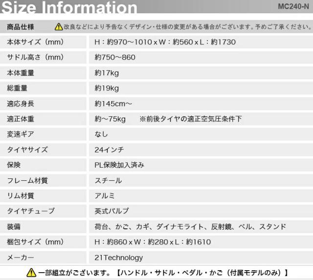 【メーカー直売】自転車 ママチャリ 24インチ 折りたたみ シティサイクル 通勤 通学 送料無料 MC240 21technology
