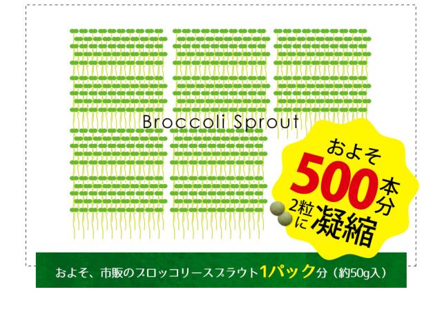 主要原料(1粒あたり):ブロッコリースプラウトエキス加工粉末 50mg / ブロッコリー末 50mg / ブロッコリースプラウト粉末 5mg